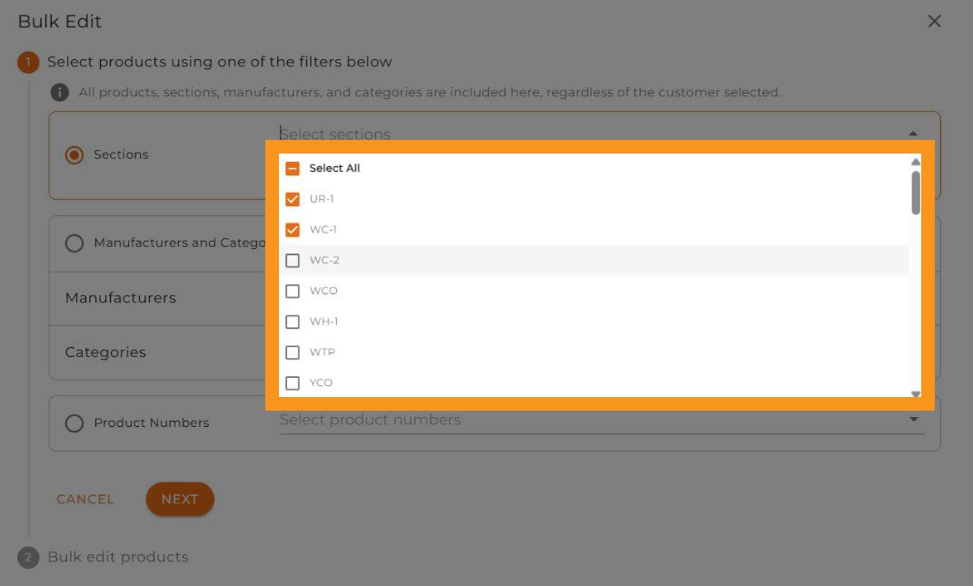 If you do not choose specific products you can choose to bulk update specific sections as you see below: